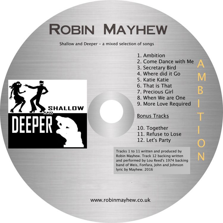 Shallow and Deeper is an eclectic compilation of original songs, all, except track 12, written and produced by me. Track 12 uses Lou Reed's 1974 backing band's composition by Weis, Fonfara and John with lyrics by me and I sing on 10 of the 12 titles, each to appeal to listeners of all tastes and ages. While I can't say my music compares with David Bowie's, the dedication of my CD to his memory is a heartfelt tribute to a unique and unforgettable friend.